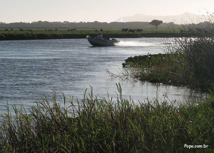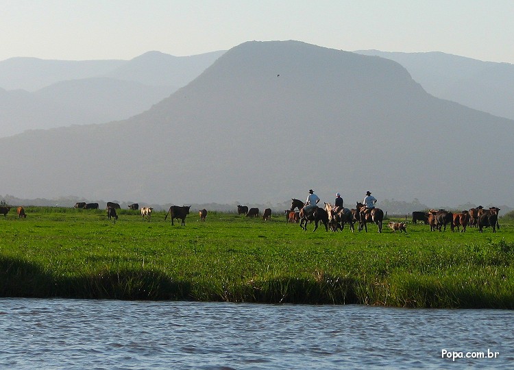Tropeiros na margem do Rio Tramandaí. Ao fundo, o Morro Alto e a Serra Geral (Litoral Norte do RGS)