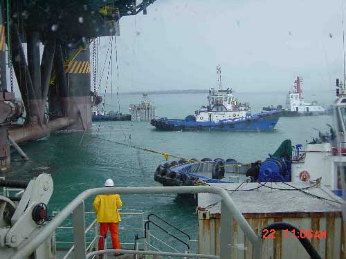 A P-40 é uma plataforma de produção projetada para a vazão diária de 150.000 barris de óleo e 3 milhões de m3 de gás, aos preços atuais gerará uma receita de mais de 5 milhões de dólares por dia. É a plataforma de maior deslocamento da PETROBRÁS, com 42.000 toneladas. Ficará ancorada na Bacia de Campos, ao largo do Cabo de São Tomé, em profundidade de 1.080 metros. Para o transporte da P-40 foi decidida a utilização do sistema "Dry Tow" (foto acima) no qual a plataforma vem fora da água, no convés de um navio. O navio selecionado foi o Migthy Servant I, da empresa belgo/holandesa Dockwise. Este tipo de navio é um misto de submarino pois afunda parcialmente permitindo que a plataforma, ainda flutuando, seja posicionada acima de seu convés. Com a plataforma posicionada o navio retira lastro de seus tanques, emergindo e levantando a plataforma que fica em seco. Nunca antes havia sido transportada em "Dry Tow" uma carga com as dimensões e peso da P-40. Este transporte se tornava ainda mais crítico pela necessidade de passagem pelo Cabo da Boa Esperança, anteriormente chamado pelos portugueses, com razão, de Cabo das Tormentas. O Migthy Servant I tem 190 metros de comprimento 50 de boca e 42.000 toneladas de deslocamento. A P-40 tem 123m de comprimento 83 de boca e também 41.000 toneladas de deslocamento. Para o transporte a P-40 ficou em posição transversal ao navio, com partes de sua estrutura para fora do navio, 43 metros para BB e 37 metros para BE. Estes trechos em balanço são, inevitavelmente, expostos às ações das ondas. Aceito o voluntário lá fui eu para Cingapura em 20 de outubro, deixando a Susy aqui no Rio a não ver navios. O desconforto das 26 horas de vôo foi pouco sentido devido à emoção da viagem marítima. Em Cingapura ocorreu uma mudança de planejamento, atrasando a saída da P-40 que só ocorreria no dia 30 de novembro. Este atraso fez com que a travessia do Índico ocorresse durante o primeiro mês da estação de ciclones, o que se transformou num risco adicional para o transporte.