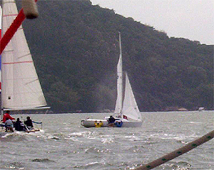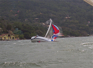 Pena não conseguirmos registrar tudo, mas não esperávamos que o vento entrasse antes das 12:00hs. O único caso sério foi o de um bruma 19 que emborcou e foi ao fundo, vai foto anexa do top do mastro no final da tarde, depois do susto. Muita gente se molhou , mas ninguém se machucou. Há quem fale em 40 nós, sei lá... mas que foi um ventão, isso foi. [Kriz] Cristina. |