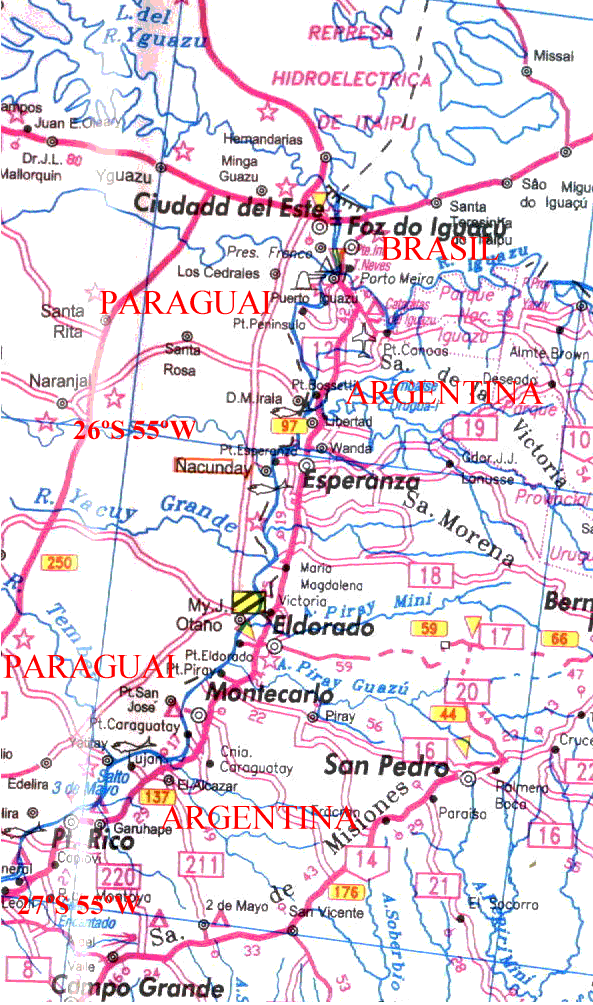!9/08/05 Sexta dia 63Seu Valdir chega cedo e eu ja estou com tudo pronto, o dia esta bom e eu estou louco por mais aventuras!D. Leoni, esposa de Valdir me da um envelope com santinhos, muito amavel!Descemos com o jipe a ladeira do clube ate a rampa. Eles se vao, arrumo tudo e entro no caiaque na forte correnteza, sao 8:30 h. Aceno para Dona Leoni no alto da barranca e sigo em frente, antes fiz o sinal da cruz, e uma nova etapa!Estou euforico demais, parece que a viagem esta iniciando hoje!Barrancas de uns 50 m, vou seguindo ate que vejo o que parece ser uma falha na barranca da esquerda(Brasil). Ja se passou meia hora, e o rio Iguacu esta ali. Para boreste o marco do paraguai, na proa tenho como alvo o marco argentina e na °esquina° de bombordo uma construcao circular, e o Brasil que so vou rever daqui ha tres meses...Triplice fronteira! Eu estou vendo pela primeira vez, remando pelo rio Parana em um caiaque desde Brasilia...Cara! Custa a cair a ficha, que loucura!Encosto ali para filmar e fotografar, estou emocionado!Como e bom ser assim, um aventureiro!Simplesmente estou °voando alto°, quantos que nao sao daqui fizeram isto, vendo as tres fronteiras por agua?Os caras da receita disseram que a policia federal iria me interceptar se eu cruzasse a fronteira sem autorizacao, vamos ver!Subo o Iguacu e cruzo para o lado argentino e cerca de 2 km para cima chego em Puerto Iguazu, 8:50 h. Aqui cruzei de bike vindo de Porto Alegre. Antes passei uma noite inesquecivel no mirante da Garganta do Diabo com bicicleta e tudo; foi noite de lua cheia e fiquei olhando as cataratas iluminadas pela lua e tocando minha gaitinha de boca...Repeti isto na alto da montanha em Machu Pichu, Peru...Vi as geleiras desabando no sul, noites de lua em plena selva no Rio Amazonas, o Deserto de Atacama, os canyons gauchos, trilhei atraves de sonhos, ate onde fui eu nao sei, mas tenho a certeza de que fiz minha vida ter valido a pena, como tenho esta certeza agora, aconteca o que acontecer!Uma senhora paraguaia fala que ano passado uma onca devorou um turista nas passarelas onde dormi, deve ter sido uma loira, assim ate eu!Diz que so encontraram um pe dentro da bota, mais uma para eu me preocupar!Vou no quartel da prefectura naval e falo com o comandante. Ele solicita que eu informe todos os dias quando chego, quando saio, para nao cruzar para o Paraguai, dormir em destacamentos navais e nao dormir em praias ou matos polis e muito perigoso pelos ladroes e pelos °tigres° (oncas).Se nao encontro destacamento tenho que ligar pelo telefone 106 ou vhf canal 12 ou 16: caso contrario eles sairao de lancha para me encontrar.Isto vai contra meu jeito de viajar, mas e como nos tempos de Marinha, o recruta so pode falar tres coisas;- Sim senhor, nao senhor, quero morrer!Ou seja terei de informa-los diariamente para evitar gastos para eles.Isto praticamente me proibe de dormir no Paraguai.A Argentina e como uma namorada ciumenta e possessiva, nao quer nem que eu olhe para os lados, para a outra...So se eu colocar pregos nos olhos e ainda assim creio que vao rasgar...Essa namorada nao passara de dois meses...Sou levado de carro ao porto e liberad, sao 10:40 h. Finalmente posso navegar. Show!Aposto corrida com a balsa que vai para o Paraguai e ganho, desci o Rio Iguacu em 10 min e dobro a esquerda (km 1927), olhando mais uma vez as 3 fronteiras.Estou num estado de euforia que so aumenta enquanto o caiaque gira sem parar pela correnteza forte que forma redemoinhos, esta dificil para manter uma rota em linha reta.-Soldado, mantenha o curso!- Impossivel senhor, estamos sem leme, a correnteza e forte e vem de todos os lados. Surgem emergencias de aguas que vem do fundo quando a correnteza bate nas pedras do fundo e sobe, fora as rochas que quase afloram...- Entao mantenha uma linha torta!O chefe sempre quer dar uma ordem, nao pode demonstrar inseguranca...Passa uma hora, a velocidade e boa e vou me acostumando.As vezes a superficie esta lisa e de repente surge uma emergencia de aguas que faz barulho e assusta, parece um chafariz submerso!As barrancas estao cobertas de selva e tem uns 50 m.Tche, e muito louco, quase assusta. Pego a filmadora e deixo o caiaque correr solto e vou filmando enquanto ele desce girando nos redemoinhos, estou maravilhado!Viajar assim entre dois paises...Cruzo com um velho navio paraguaio, casas na selva, botes a remo e lanchas de pescadores.Ha inumeras saidas de pequenos riachos e varias cachoeiras aos lados, e lindo demais!Selva, selva, selva...E barra pesada dormir ai, pelas oncas e pelos assaltos que a marinha alertou.Tenho que chegar no destacamento daqui ha 55 km, mas eu levei tres dias para fazer 50 em Guaira contra o vento e agora so tenho 5 h: acho que nao vou conseguir...Aqui e tudo estranho, onca e tigre, sucuri e anaconda, escuto galinhas cacarejando em guarani, caes latindo em espanhol...Apos duas horas vejo uma linda cascata do lado argentino e faco a volta, quero comer algo. O caiaque nao avanca contra a forte correnteza, tento 3 vezes e descubro que junto a margem e melhor para subir.Encosto e entro no riacho da cascata.Lindissimas borboletas multicoloridas pousavam em mim e no caiaque. Sento no caiaque para comer:- Sai dai, tem sucuri!Subo no barranco:- Sai dai, tem onca!Mas que saco, tenho quecomer em pe, de lado para o rio e de lado para a mata.Se uma onca me atacar o plano e facil: dou uma °gravata° nela e me atiro no rio para afogar a desgraciada: se for sucuri e so usar o punhal.- E tao facil e eficiente a teoria.Sigo em frente, ora pelo Paraguai, ora pela Argentina. Passo por Puerto libertad e aviso que vou em frente ate P. Wanda (km 1873) onde chego as 16:30, apenas 3:45 h e fiz 55 km, nao acredito!Os caras sao super legais, arrumam um trailer e levam o caiaque ate o alto do destacamento, 50 m acima. A vista dali e linda.E incrivel a preocupacao deles comigo, todos os postos ja sabem que vou passar e se comunicam por radio.Tomo banho e durmo no alojamento, tratamento nota 10!