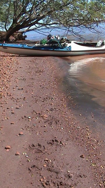 12/08/05 Sexta dia 56Parto às 9:40h, rumo ao primeiro pontal.Aleluia! Sopra um vento do quadrante norte, isto muda tudo, aprôo o barco para o último pontal que vejo no horizonte. Aqui é uma margem cheia de reentrâncias no sentido NE-SW.Dia bonito, viajo sem a capa e navego por 3h até parar para almoçar. aproveito para tomar banho nesta água gelada. ao fundo desta enseada há um farol tradicional, pintade de listras horizontais brancas e vermelhas. Vejo uma balsa carregada de caminhões vir do Paraguai. Ela passa por trás de uma ilha que eu não havia visto.Sigo em frente, o tempo passa e remo muito forte para chegar em uma ilha, mas ela é ruim para dormir, pequena e mato alto, remo mais forte ainda até chegar em outra onde tenho que abrir uma clareira no capim alto. Nesta só vejo pegadas de capevara e graxaim, se visse uma de onça daria no pé. Foram 6:30h de remo hoje, tem uma placa na ilha diz:Rio São Francisco - km 2001 Há uns barranquinhos de barro vermelho que gruda mais que durepoxi e que mancha asté a pele, parece uma tinta.