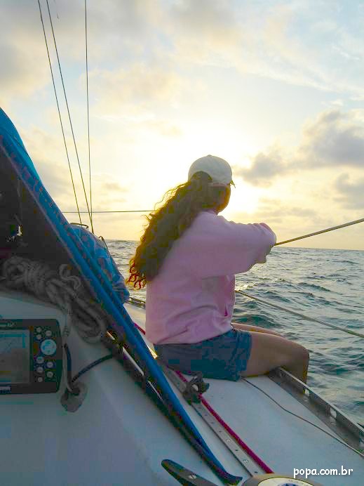 Depois, em vez de “subir” para o RJ resolvemos “descer” para São Francisco do Sul (SC). Foi ótimo. A viagem foi super tranqüila, fomos bem “por fora”, só enxergávamos mar em toda volta, o vento estava fraco mas pelo menos a favor...velejamos praticamente todo tempo de popa, surfando nas ondas... O dia estava lindo, não choveu e o pôr-do-sol foi um dos mais lindos que já vi, claro que devido ao ponto de vista... (foto abaixo). Levamos 20 horas até lá. O único problema foi o cansaço, pois só nós dois no barco, ninguém podia dormir nunca, sempre os dois juntos, para quem estava no leme não cochilar... Praticamente não mexíamos nas velas. Poucas vezes tivemos que caçar um pouco a genoa ou correr o traveler...no mais, era manter o rumo. Então, quando já era 1h da manhã e a recém estávamos entrando na 1ª bóia do canal de São Chico, o sono estava atropelando meu raciocínio... Fiquei no leme enquanto o Carlos lia a carta da região e buscava o melhor trajeto para a gente entrar e fiz a maior força do mundo para não dormir ali mesmo, sentada no cockpit...mas deu tudo certo. No outro dia, dia 31/12, entramos no “Capri Iate Clube” e ali a viagem no mar acabou para mim. Voltei para Porto Alegre em uma aventura de ônibus de uma cidade para outra, passando o Ano Novo na estrada até chegar em casa na manhã do dia 1º de janeiro. Não vi nenhum golfinho no mar (só os tucuxis nas baías de Paranaguá e Cananéia), meu doutorado me pareceu mais difícil esta hora, menos tempo, menos dinheiro... Mas foi tudo inesquecível! Márcia Bozzetti |