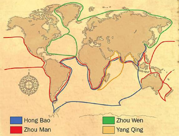Os demais oficiais cruzaram a costa sul da África na direção das "terras escuras". Zhou Wen zarpou rumo ao noroeste, em busca da mítica Terra de Tusang. Encontrou o Pólo Norte, a costa norte-americana, o Caribe, a Groenlândia e a Sibéria. Para o sul, navegaram Hong Bao e Zhou Man. Ambos aportaram na costa do Nordeste do Brasil em meados de 1421. Depois, Man atravessou o Pacífico, mapeou a região e descobriu a Austrália e a Nova Zelândia - 300 anos antes de James Cook. Bao avistou a Antártida. Seus cartógrafos mediram o Cruzeiro do Sul e estudaram o regime das correntes. No trajeto, as frotas recolhiam riquezas e vendiam porcelana, seda e plantas. Também fixavam colônias e ensinavam técnicas agrícolas. Para Menzies, a contribuição maior da China foi a disseminação da agricultura. Ao chegar à América, os europeus não perceberam que os índios cultivavam plantas exóticas (coco e inhame) e criavam galinhas trazidas da China. Exames recentes de DNA sugerem o parentesco de indígenas brasileiros e maoris com os chineses.